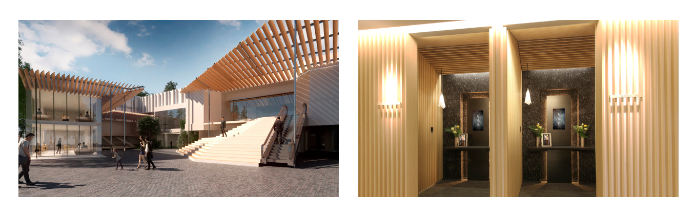 横濱聖苑では、世界的建築家である隈 研吾氏を建築デザインで起用。木屋根を介して、大きく飛躍する都市「横浜」と繋がる《葬儀・葬祭納骨堂*》を創ります。