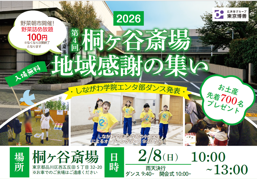 広済堂グループの東京博善株式会社は、2026年2月8日(日) 東京都品川区にある桐ケ谷斎場で、地域の皆さまなどを対象としました「地域感謝の集い」を開催いたします。