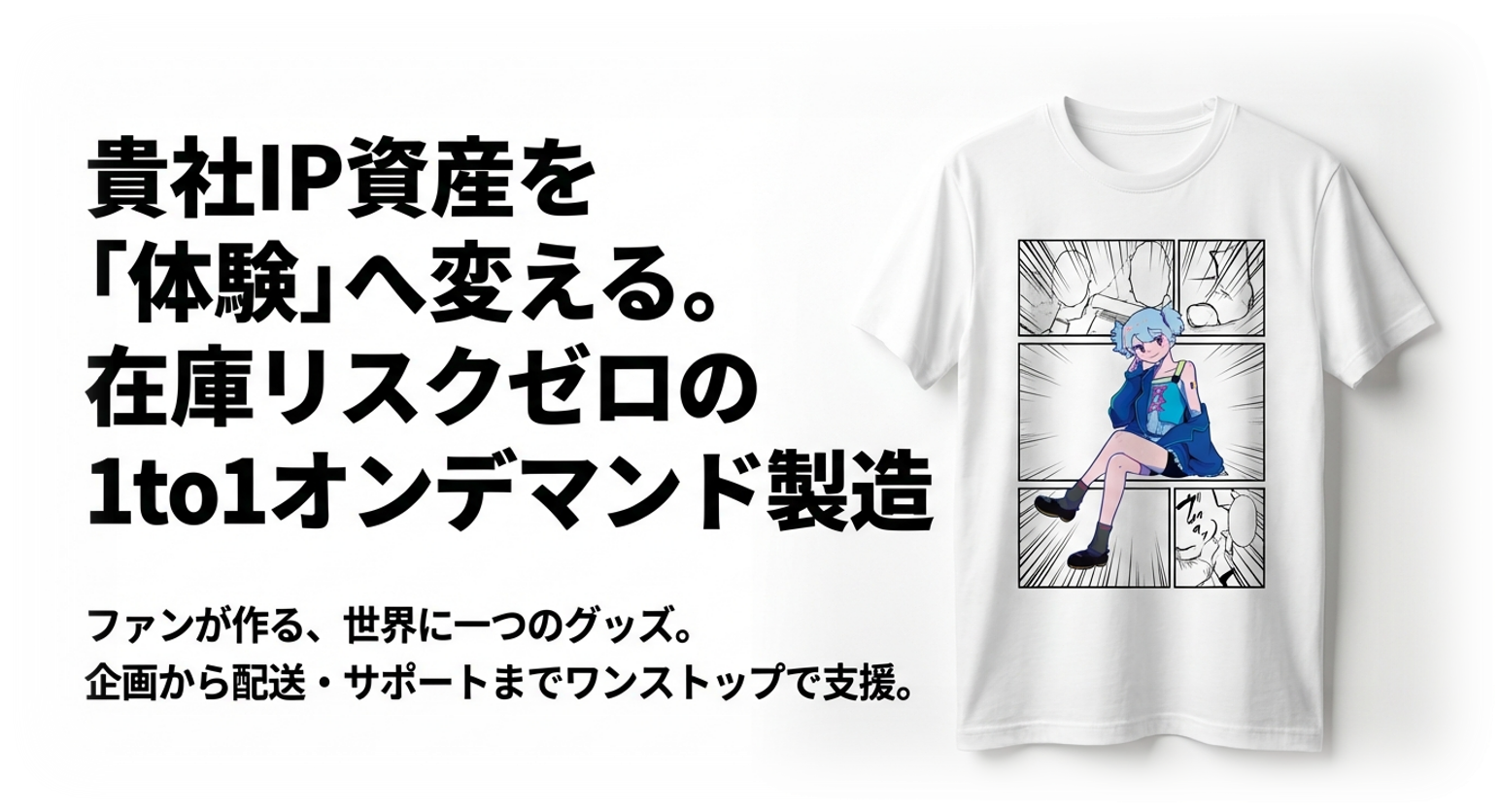ユーザーが自らデザインを行う参加型システムにより、在庫リスクをゼロに抑えつつ、ファンとの深い絆を創出します。2025年度より大手出版社様との取り組みも開始し、製造、配送、BPOまでを完全ワンストップで支援し、IPビジネスの新たな価値をご提案しております。