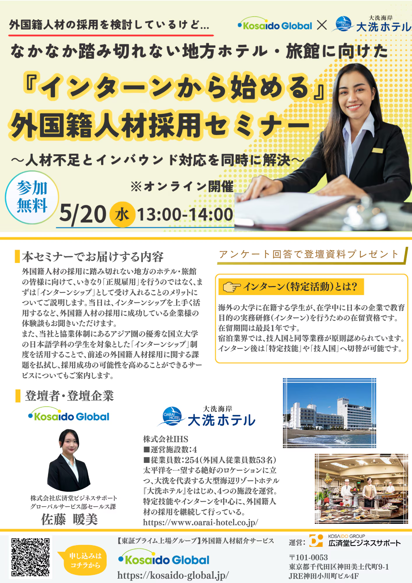 NEWS【広済堂ビジネスサポート】地方のホテル・旅館に向けた 『インターンから始める』 外国籍人材活用セミナーを「5/20(水)13:00-」開催!〜人材不足とインバウンド対応を同時に解決〜